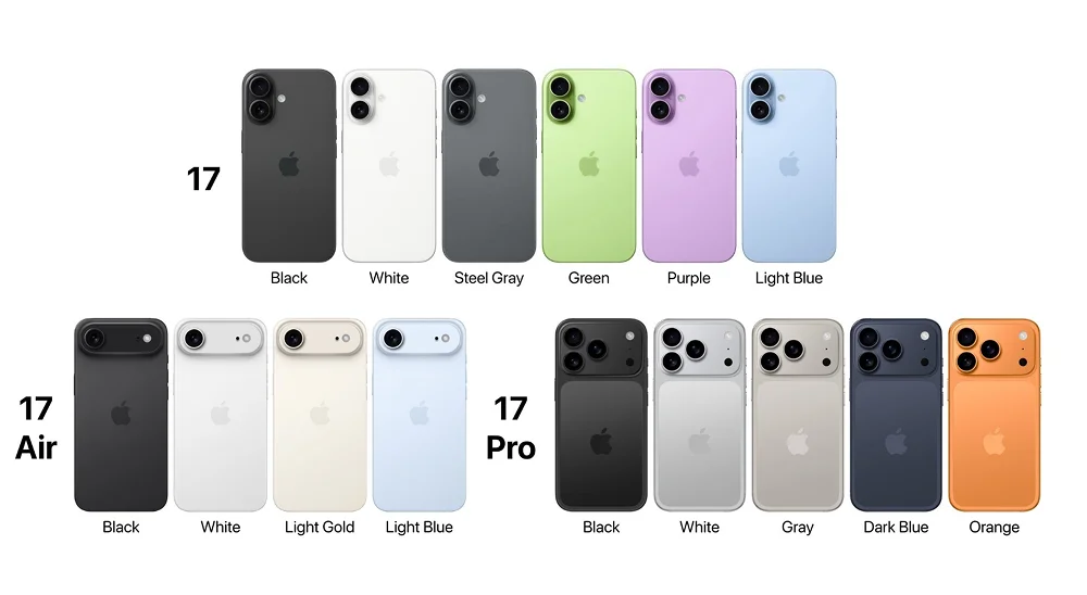 iPhone 17 (estándar): negro, blanco, gris acero, verde, púrpura y azul claro.